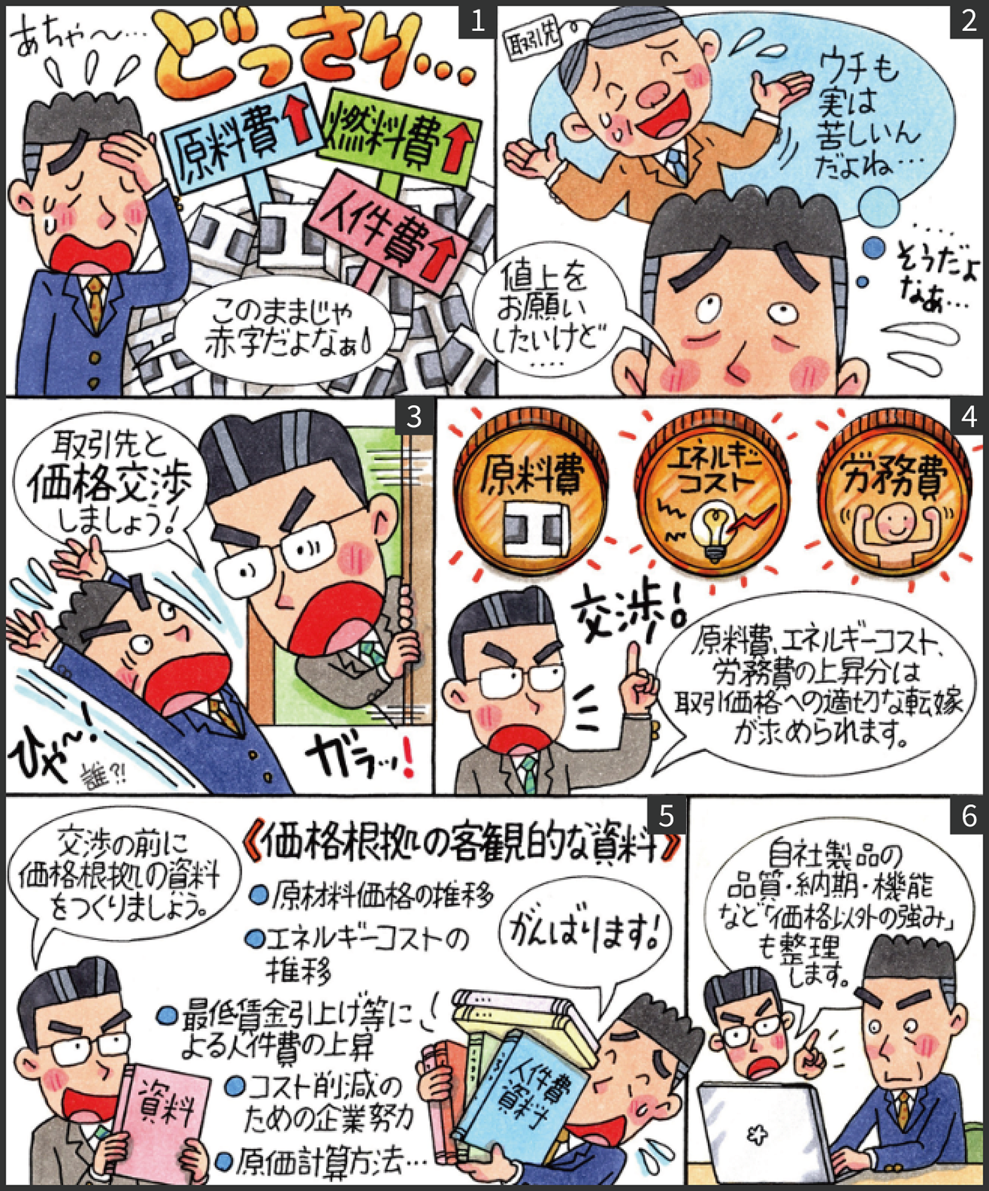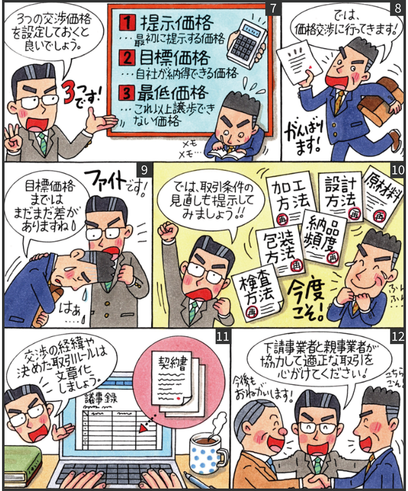 今回のマンガでわかるシリーズでは、売り手である下請事業者(中小受託事業者)が、買い手である委託親事業者(委託事業者)に、価格交渉を行うためのテクニックやポイントについてご紹介します。