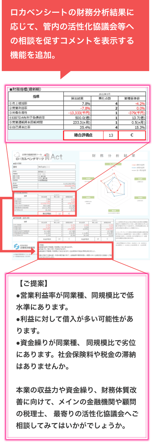 2022年11月、近畿経済産業局ではローカルベンチマークAct(略称:ロカベンAct)を公表しました。ロカベンActとは、経済産業省が提供するローカルベンチマークを発展させ、入力された財務情報をもとに、収益力や資金繰りなどの観点から事業者に適した相談先を提案する機能を追加した近畿経済産業局独自の経営分析ツールです。