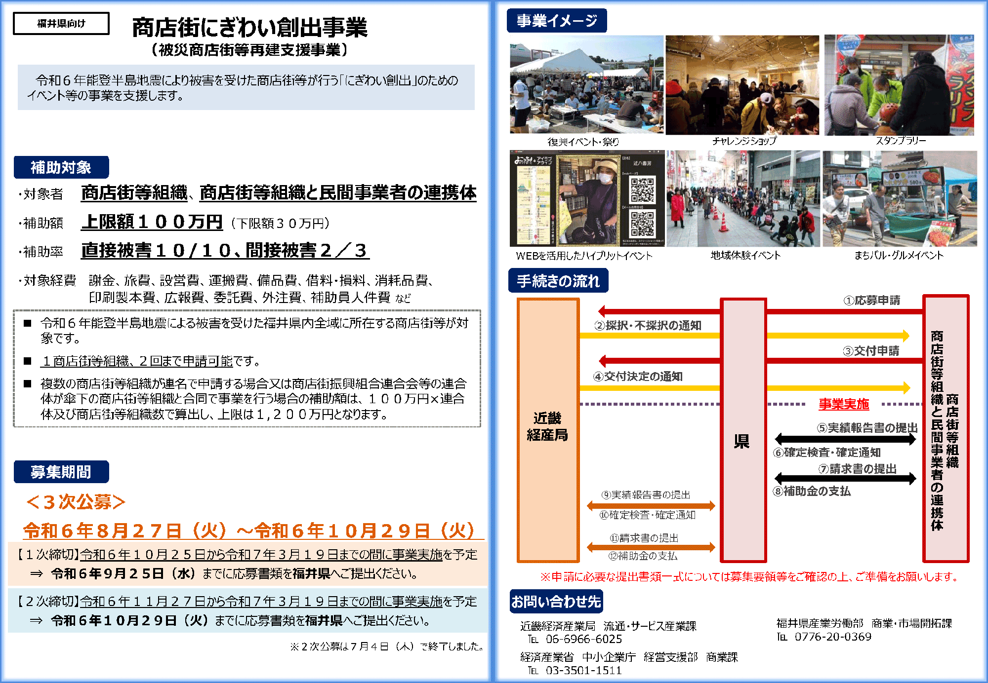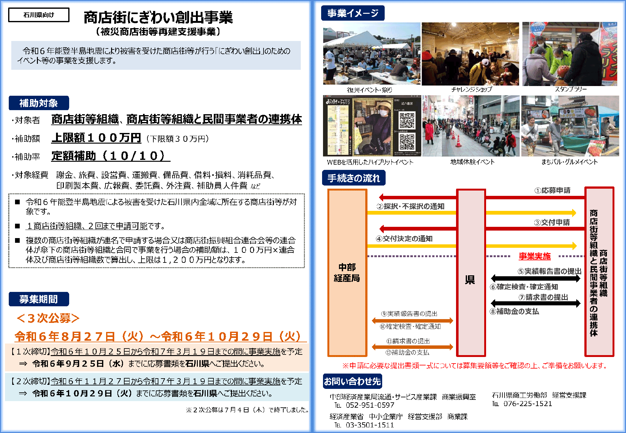 能登半島地震により被害を受けた商店街等が行う「にぎわい創出」のためのイベントなどの事業を支援する「商店街にぎわい創出事業」の3次公募が本日より開始されました。詳しくは下記のチラシをクリックしてご覧ください。