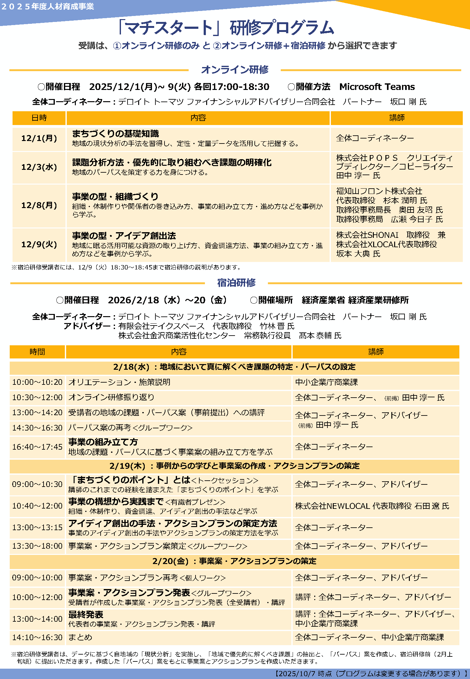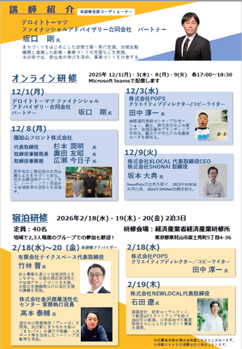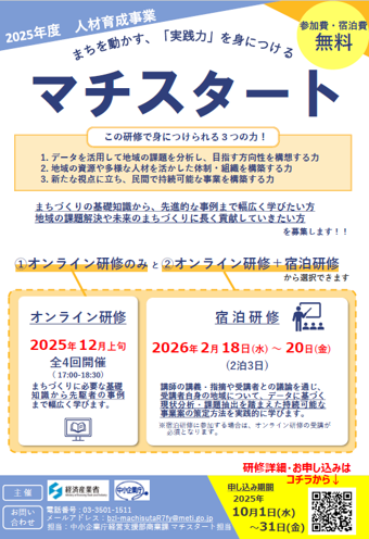 中小企業庁は、まちづくりの基礎知識から、先駆的な事例まで幅広く学び、地域で実践する力を身につける人材育成事業「マチスタート」を実施します。