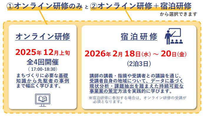 ①オンライン研修のみ と、②オンライン研修+宿泊研修の2つの参加方法があります。