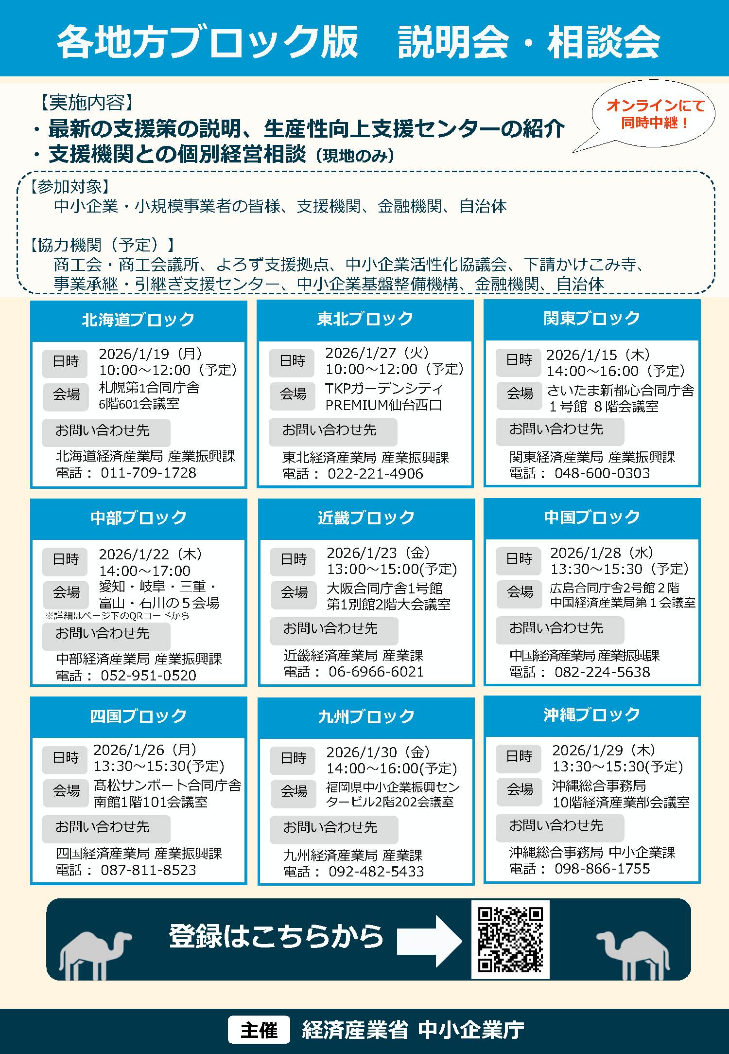 各地方ブロックにおいて、賃上げに関する最新の支援策やその活用法についての説明会・相談会を1月中下旬に開催予定です。また、相談会ではよろず支援拠点などの専門家のアドバイスを受けることが出来ます。