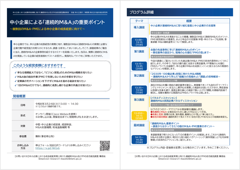 本セミナーでは、M&A実施回数による業績への影響や、実施企業に共通する「10の重要ポイント」等の調査結果を報告するとともに、企業による事例講演、パネルディスカッションを通じて、実践的なノウハウを共有いたします。