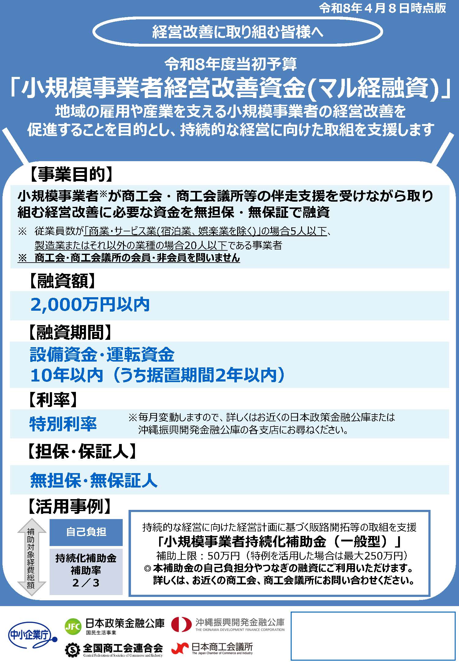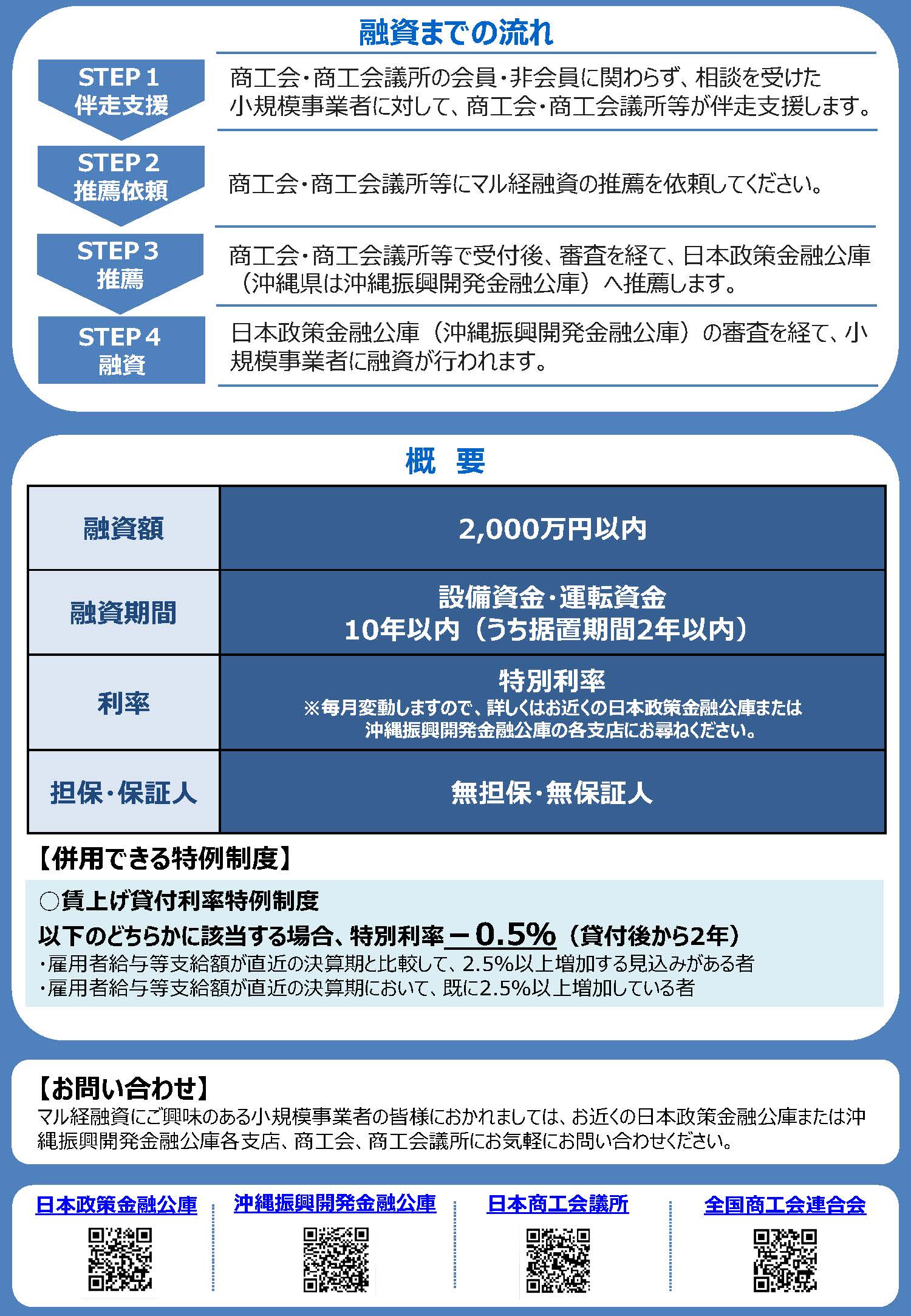 詳しくは、お近くの日本政策金融公庫各支店、沖縄振興開発金融公庫各支店、商工会、商工会議所にお問い合わせください。